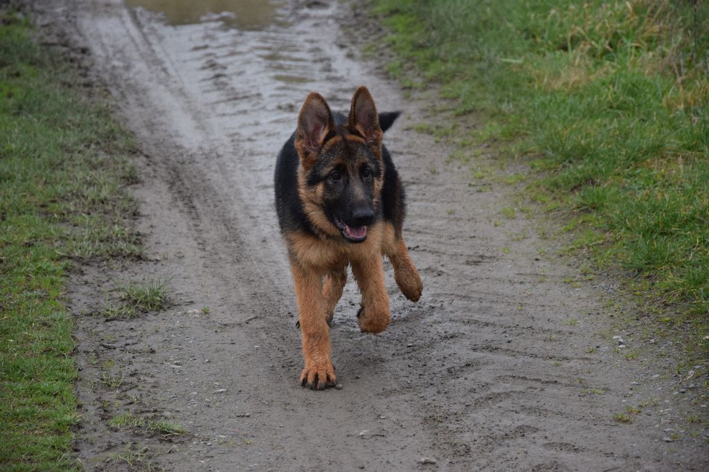 Dentition complète en ciseaux Excelent oeil forme et couleur Oreilles bien implanté et portée Corps, très bon proportion, dos tendu, bonne croupe Poitrine de jeune bien déssinée Très bon angulation et tres bon applomt Très bon mouvement de jeune